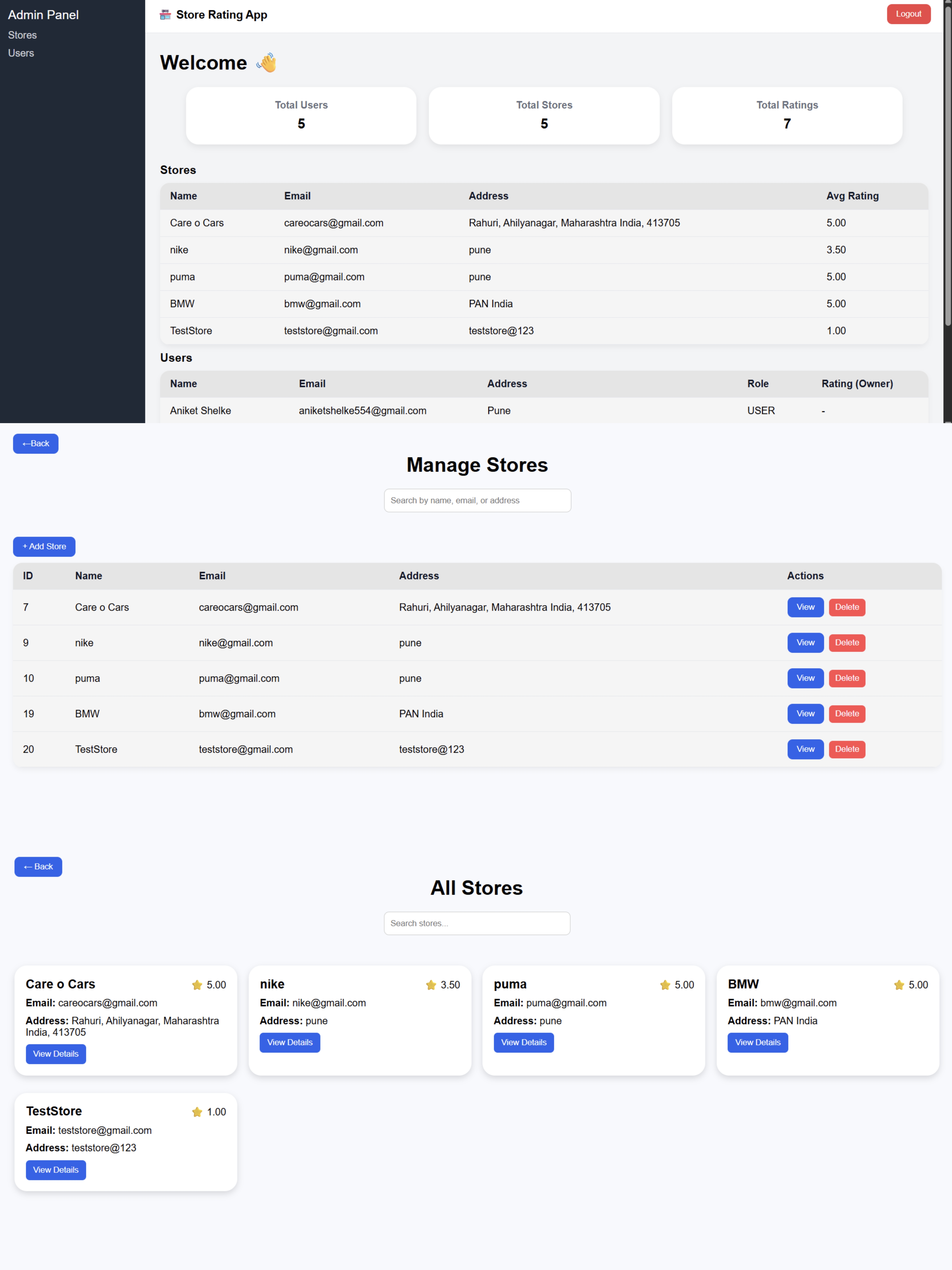 -Users can register, browse stores, submit or update ratings, and owners can monitor ratings and view